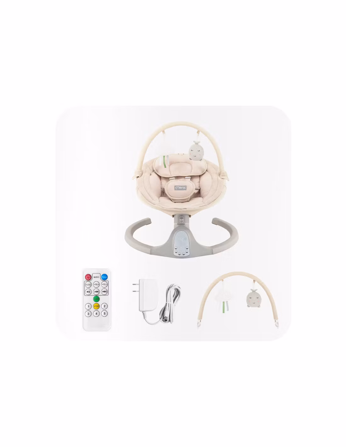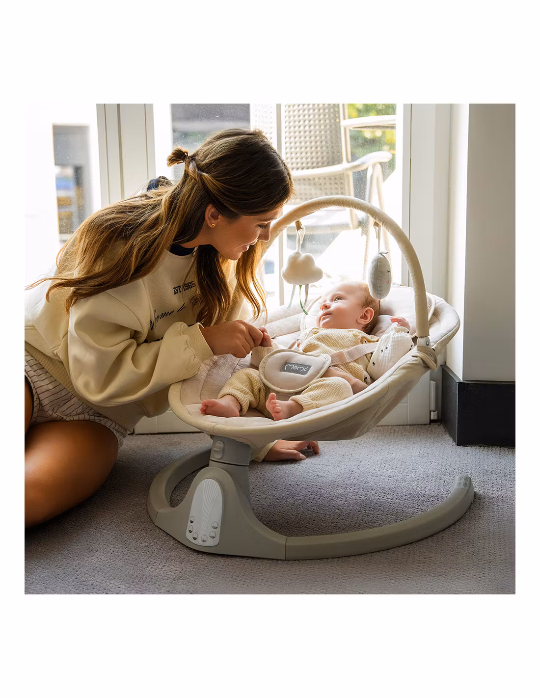MoMi KENANI SAND elektrisk babysitter är både vacker och funktionell, och viktigast av allt – den tar hand om ditt barns komfort och säkerhet.Gungfunktionen mot