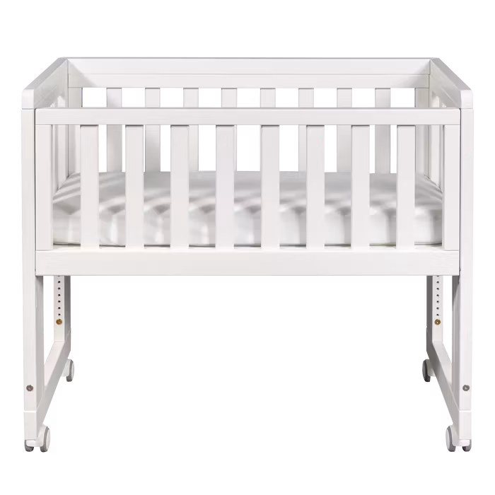 Bedside Crib Oslo är en vit säng/babysäng i ett smart och säkert designutförande. Den långa sidan kan fällas ner, och bottenplattan kan justeras i tio olika höjder. Hjul ingår.