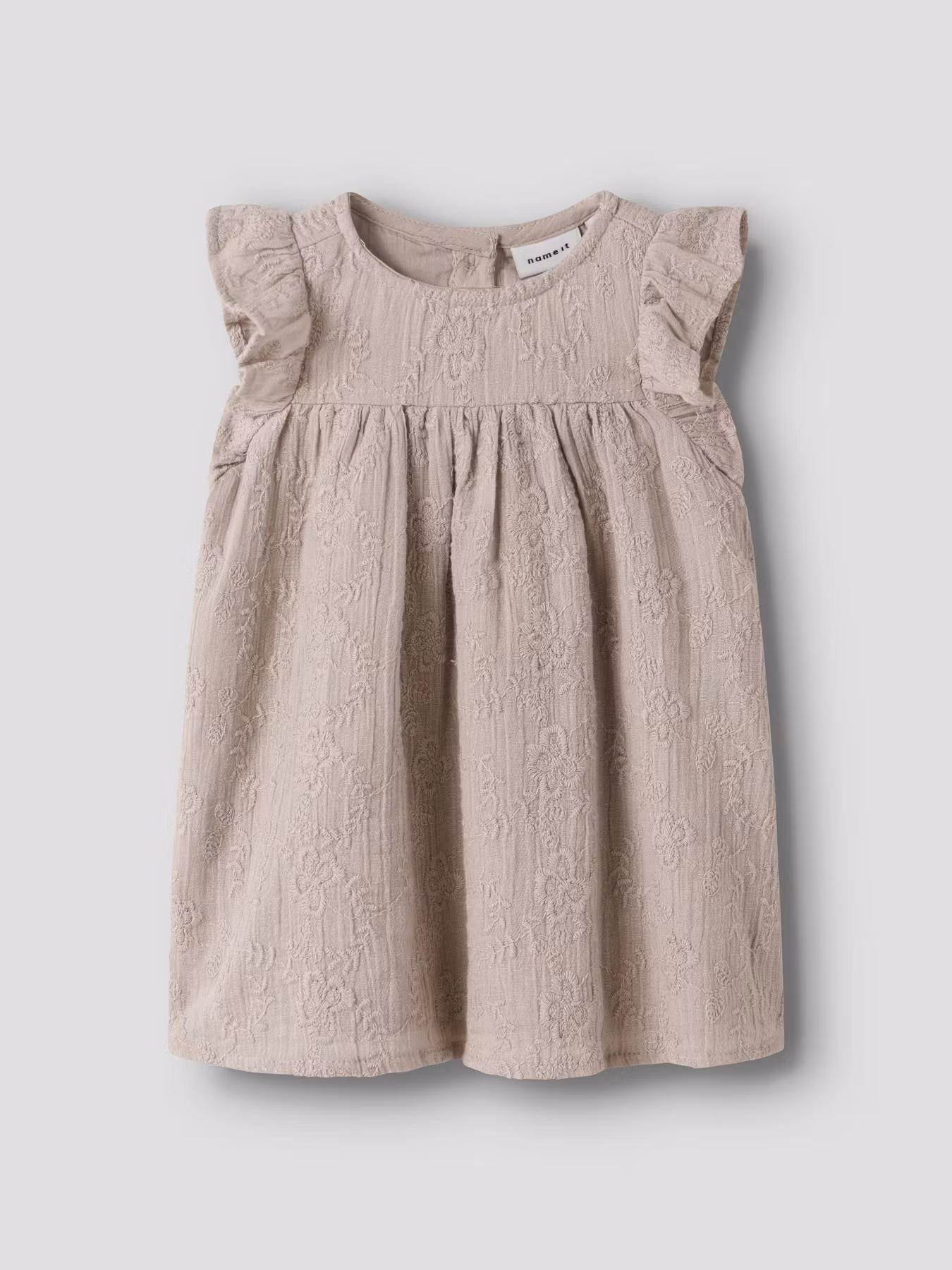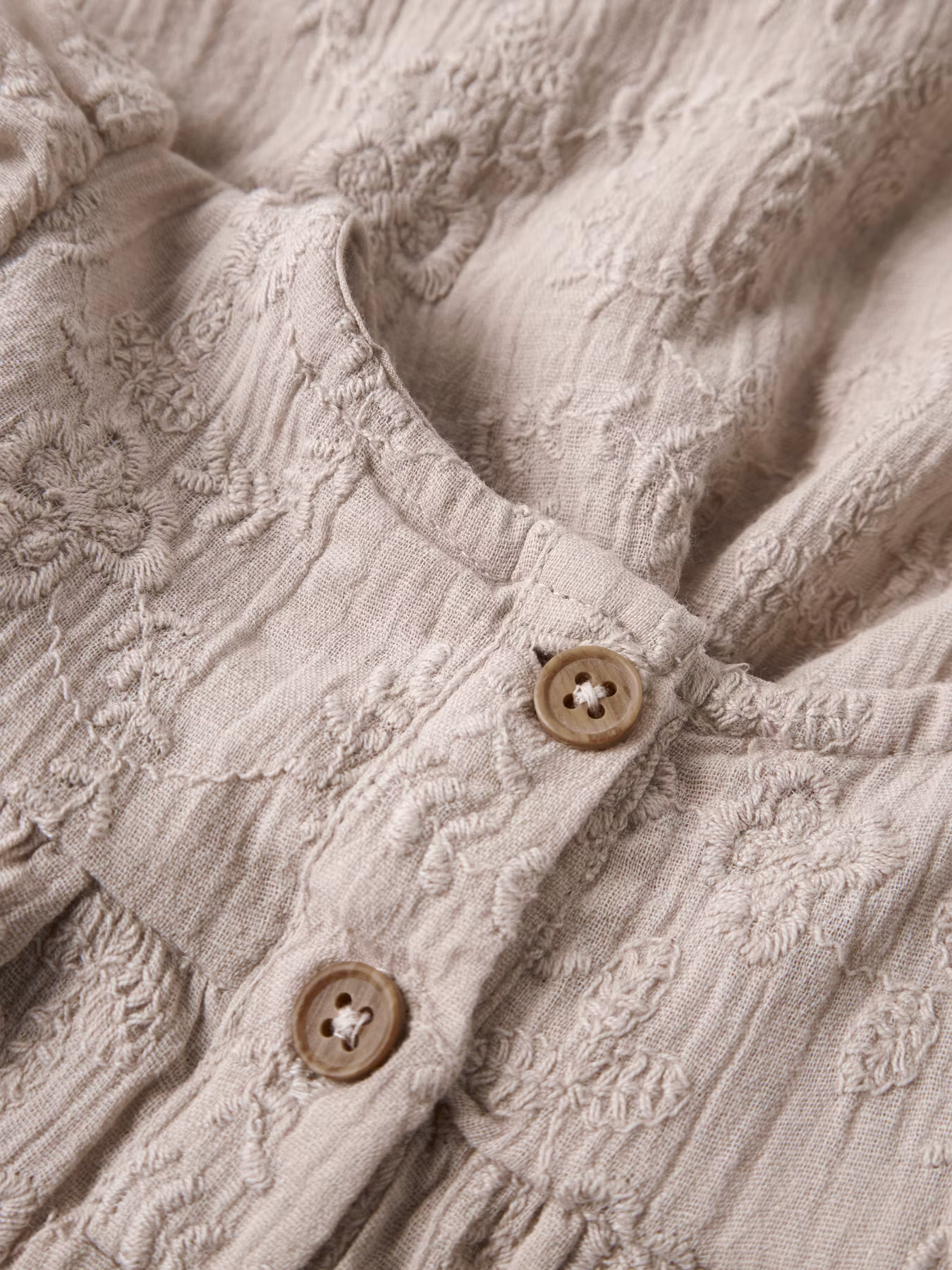 Söt klänning med broderi i blommönster100% Återvunnen bomullMaskintvätt 30 grader, torktumla inte, använd inte blekmedel. Tvättas med liknande färger.Storlek 50