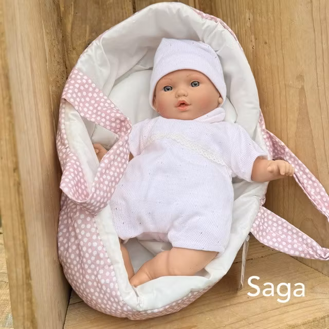 Denna dockan har en kropp av tyg, armar och ben är av vinyl. Längd ca 40 cm. Dockan är mjuk och kramgo och ligger i en docklift.Leverantören Marina & Pau ha