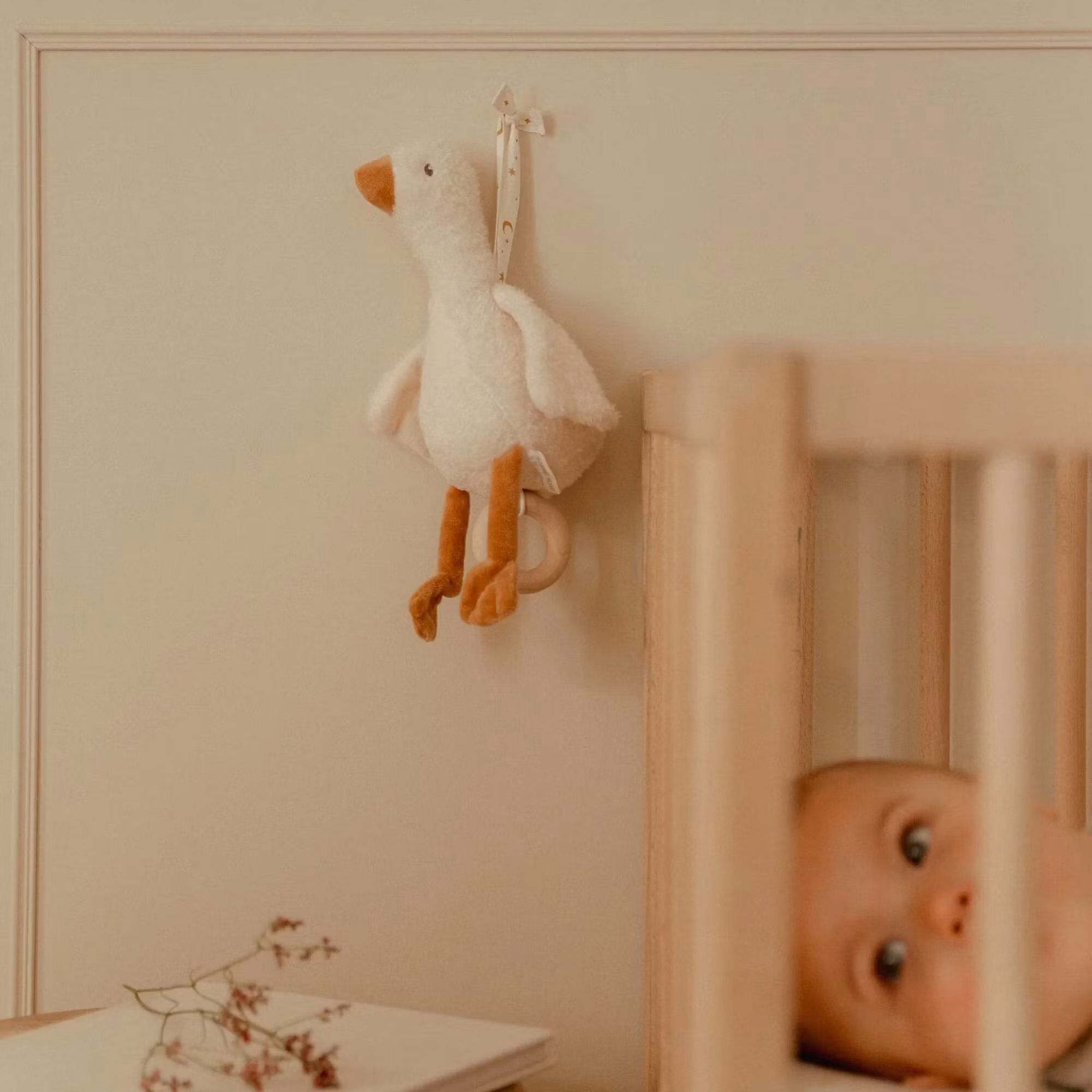 Dra försiktigt i snöret och låt Speldosan Little Goose spela en ljuvlig melodi.De rogivande tonerna hjälper ditt barn att slappna av och gör läggdags extra mysi