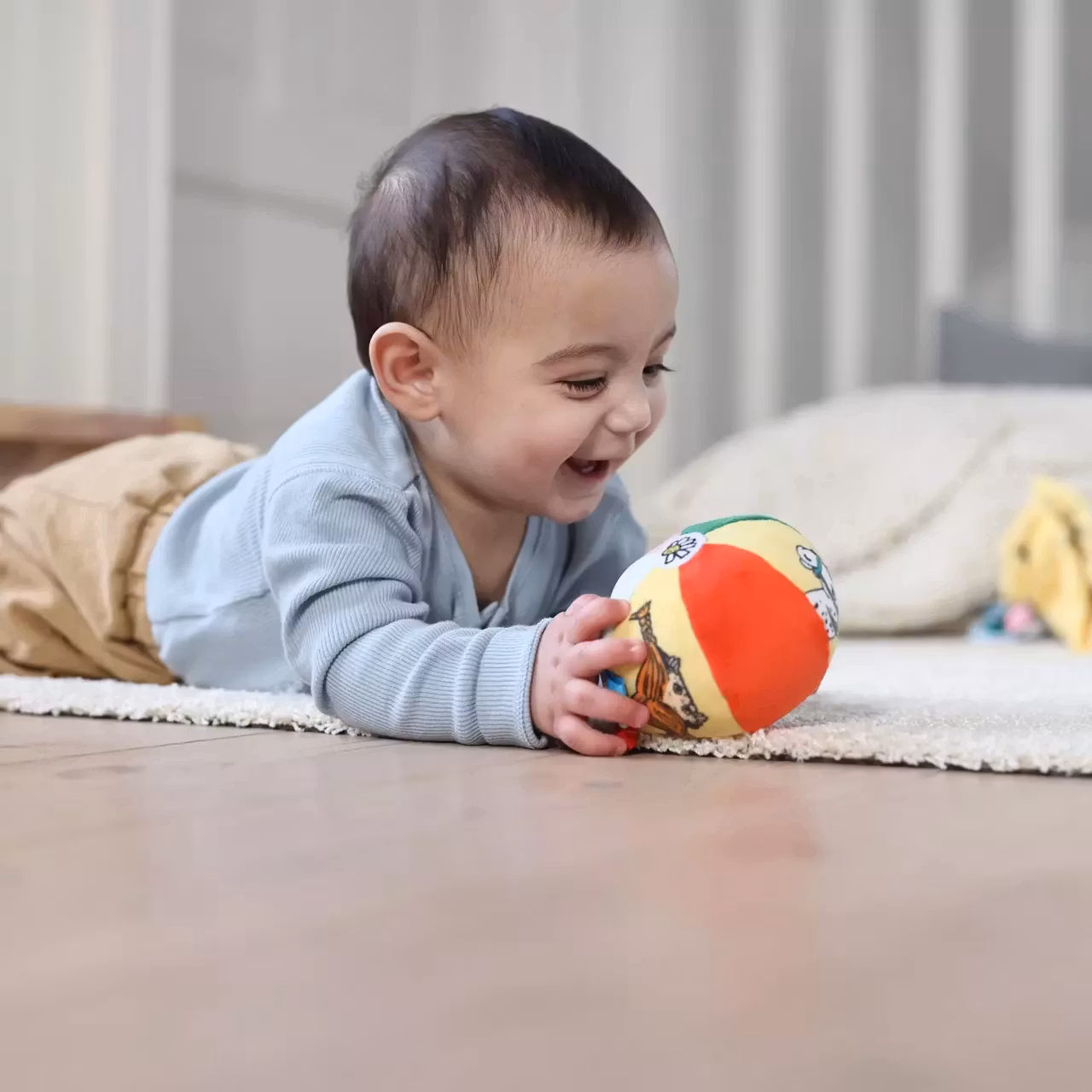 Låt barnen rulla, greppa, känna och lyssna! Den här supermjuka bollen bjuder in till till timmar av utforskande lek. Pippi kikar fram bland färgglada illustrationer, och små band runt om väcker barnets nyfikenhet. Den mjuka formen och pinglande ljudet gör bollen till en rolig och trygg leksak för dom allra minsta. En perfekt första babyleksak att utforska i egen takt – liggandes, sittandes eller krypandes!