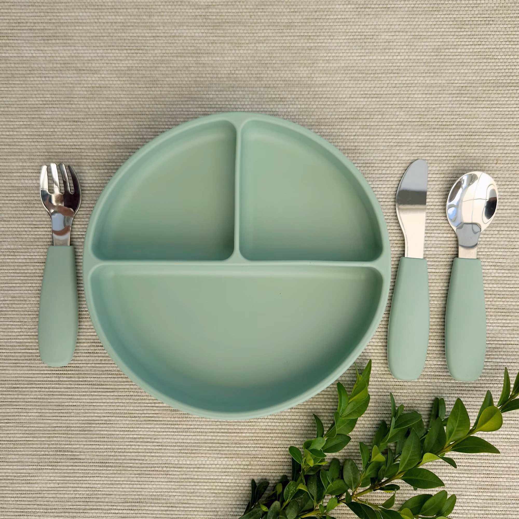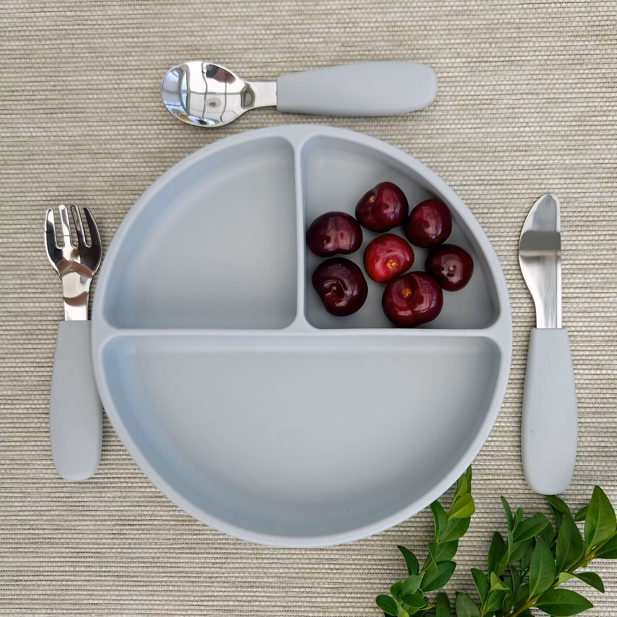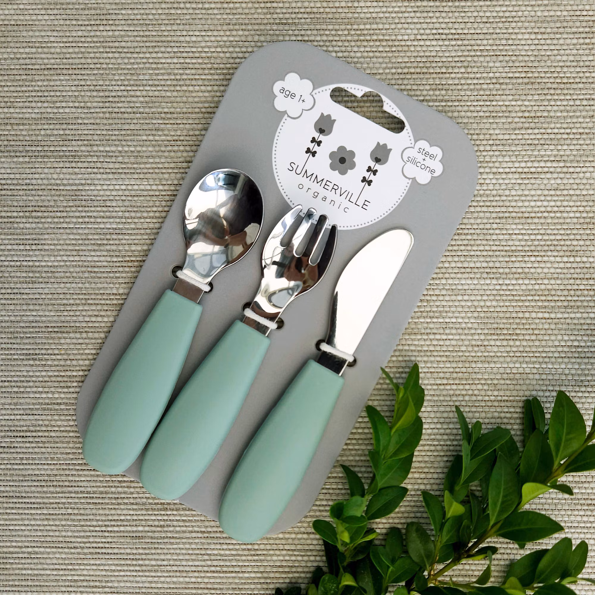 Barnbestick i rostfritt stål och silikon som är greppvänliga och enkla för barnhänder att hålla i.