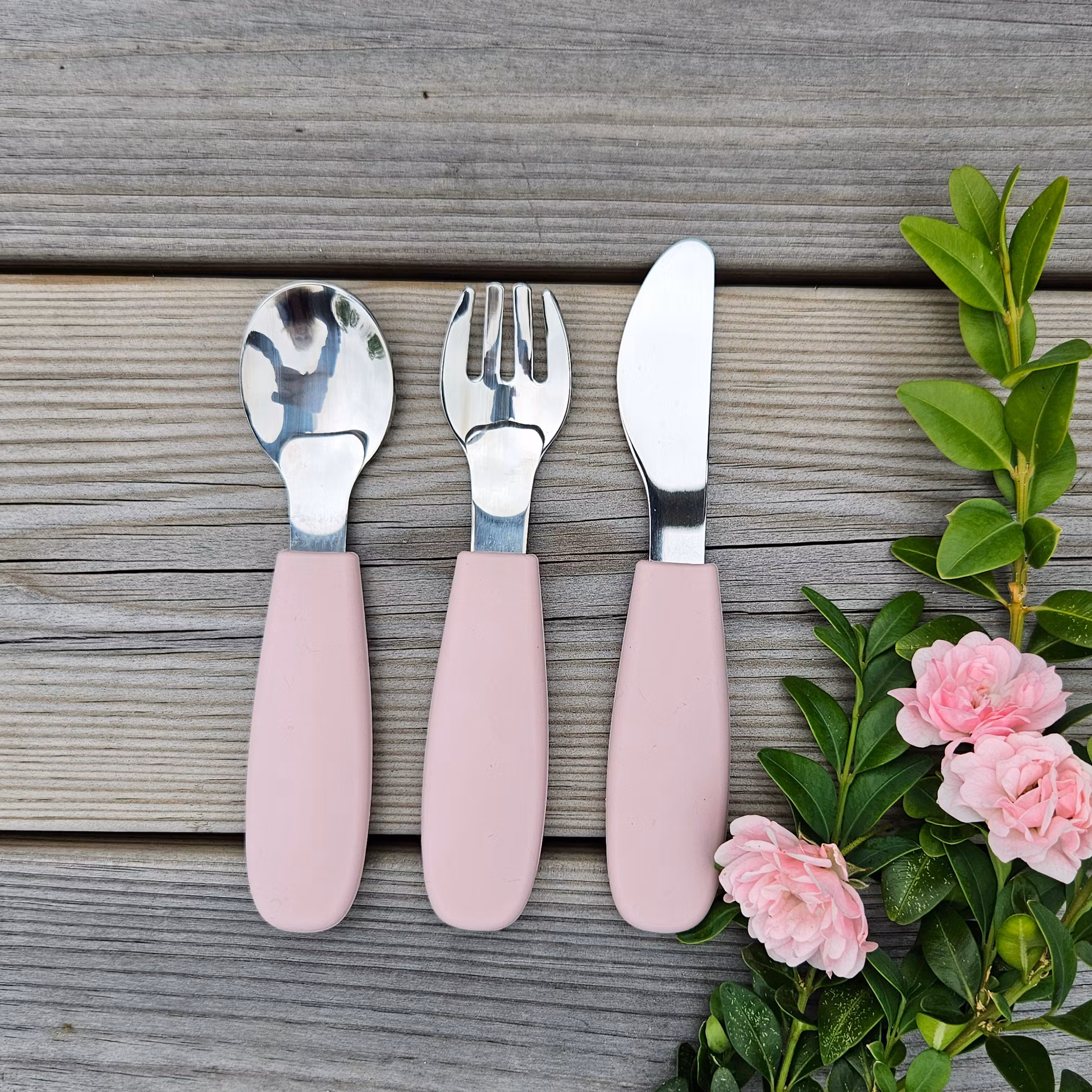 Barnbestick i rostfritt stål och silikon som är greppvänliga och enkla för barnhänder att hålla i.Besticksetet för barn består av gaffel, kniv och sked. De pass