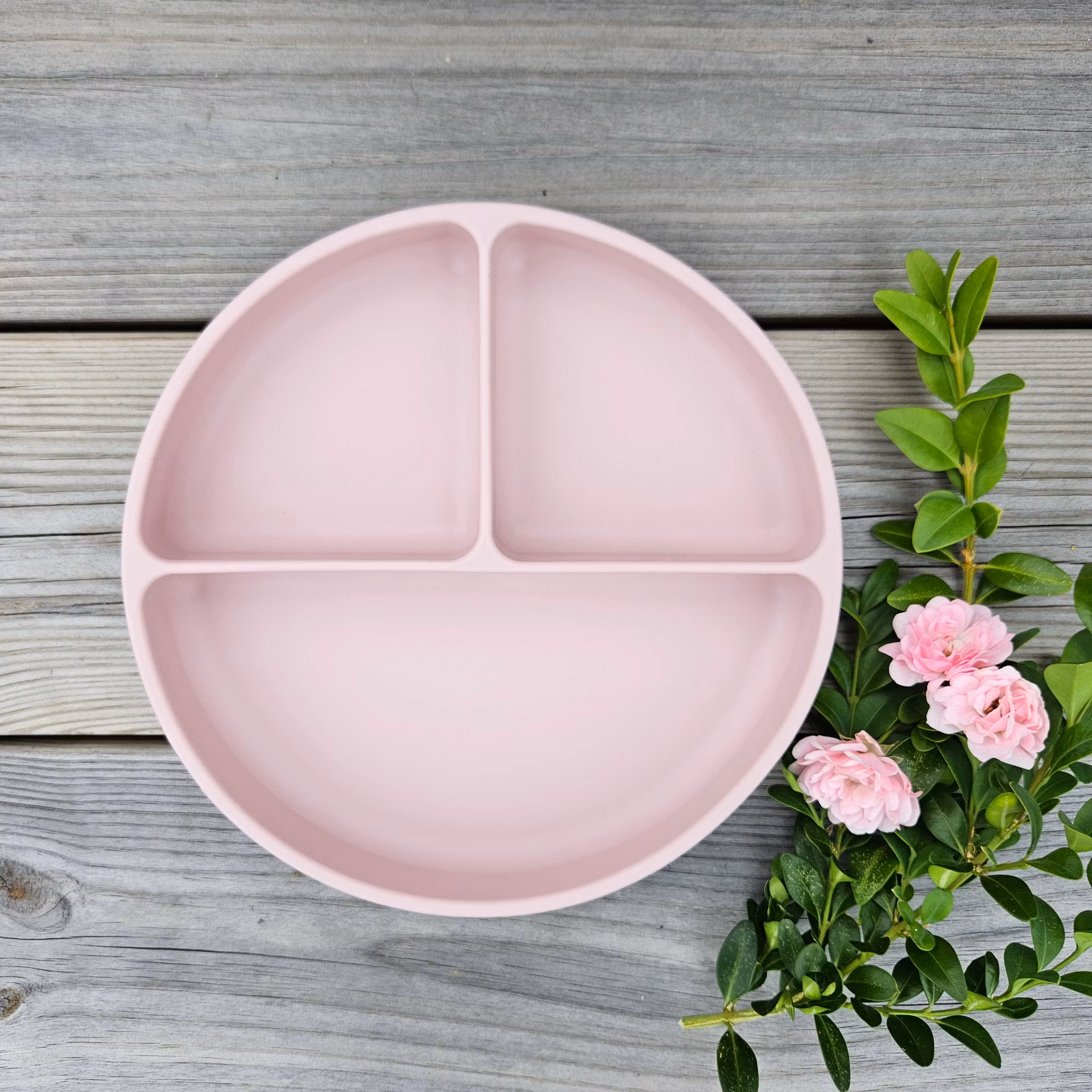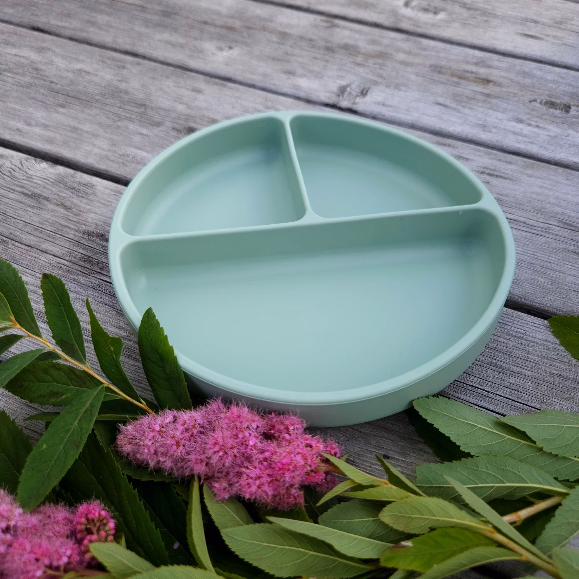 Tallrik för barn med tre separata fack för maten, i silikon.Tallriken för barn är tillverkad i 100% livsmedelsgodkänd silikon som är godkänd enligt både FDA och