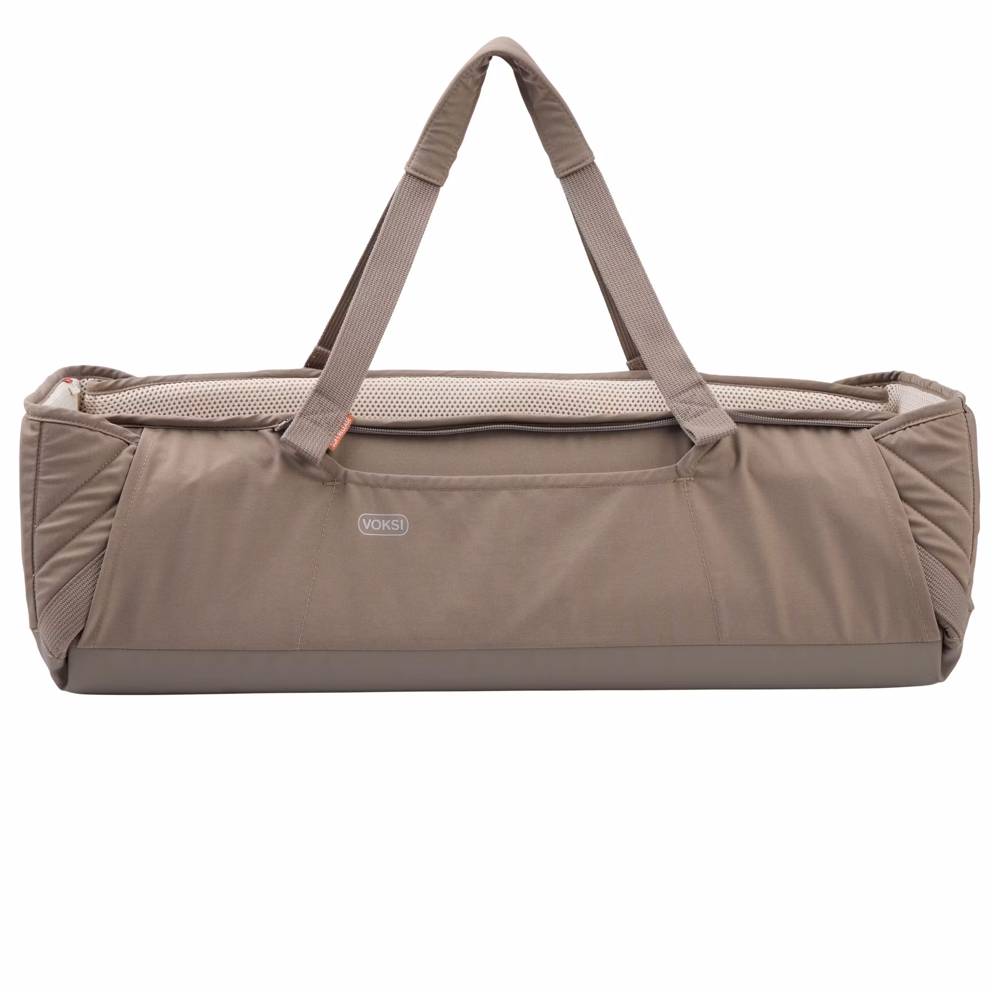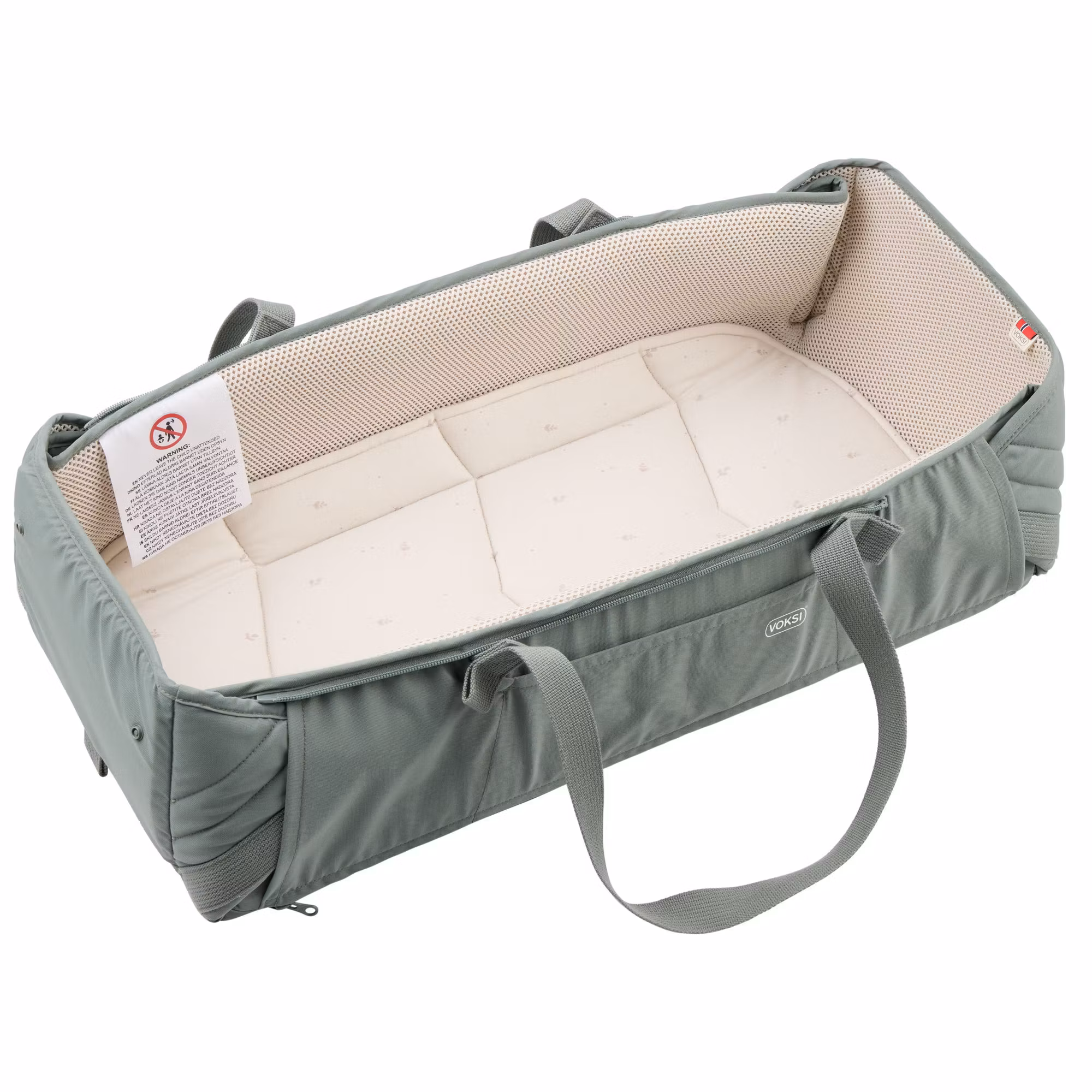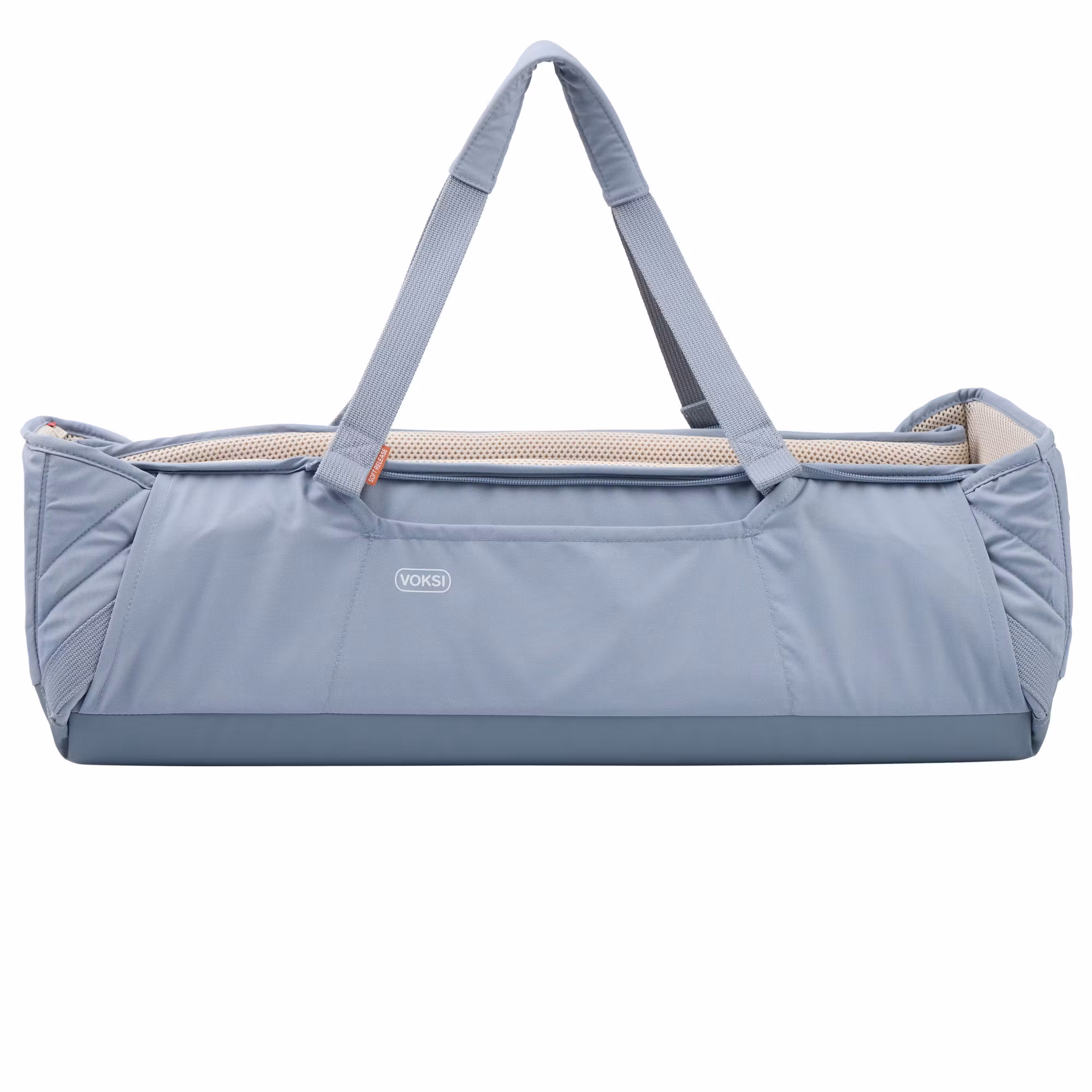 Yttertyget består av återvunnen polyester och babyliftens undersida har en yta som är lätt att torka av och tålig att sätta ner oavsett underlag. Babyliften kommer även med ett mjukt lock som är vind- och vattenavvisande för att ge extra skydd när ni är utomhus, du tar snabbt bort locket med hjälp av dragkedjorna. Den innovativa funktionen Voksi Soft Release™ gör att handtagen endast är tillgängliga när liftens hörn är låsta och uppfällda. Denna funktion gör att det blir säkrare att bära barnet eftersom hörnen automatiskt viks upp när du använder handtagen. När hörnen frigörs viks babyliften ut för att ge mer plats åt barnet, detta sker helt ljudlöst för att inte störa barnet när det sover. Varje hörn i babyliften kan frigöras individuellt. Det innebär att det går lätt att öppna åt sidan eller i fotändan för att skapa en mysig plats för barnet.