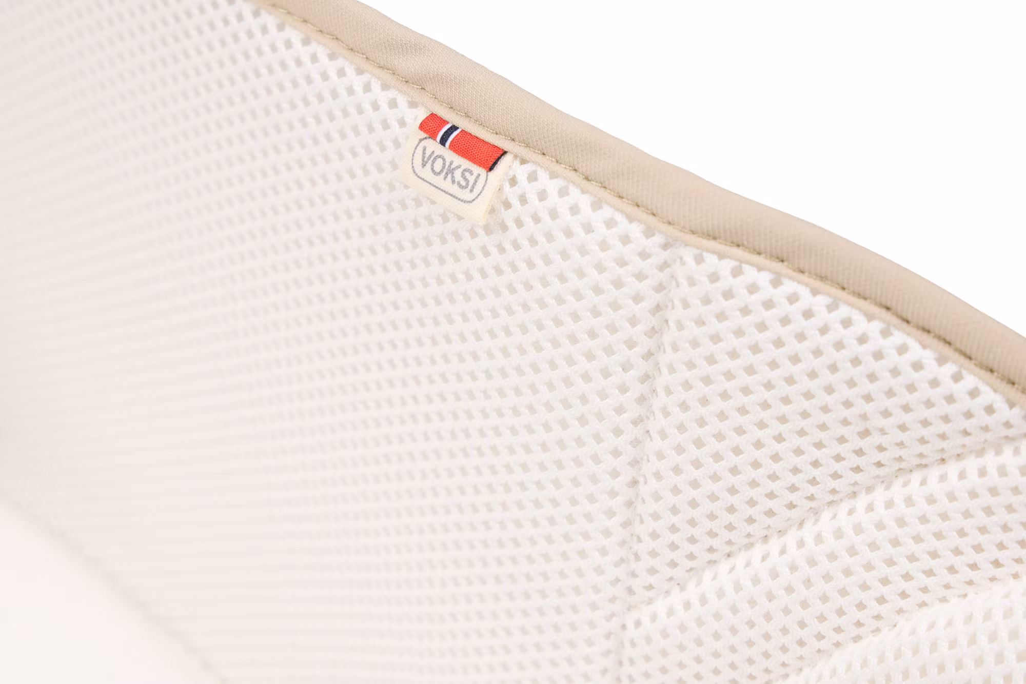 Alla material i Voksi Carry Me är OEKO-TEX® Standard 100, Klass 1-certifierade, vilket är en kvalitetsmärkning som garanterar att inga av materialen i produkten innehåller skadliga ämnen. Babyliften behöver inte tvättas före första användningen. Voksi Carry Me har en insida av 3D-mesh för att skapa en produkt som är luftig, säker och bekväm för ditt barn. En tvättbar madrass i ekologisk bomull och 3D-mesh följer med och gör liften till en mjuk plats för din bebis att ligga i. I babyliften döljer det sig en fibermatta av polyester för att göra den stadig, ett mer miljövänligt alternativ än skum som liknande produkter på marknaden ofta är fyllda med.